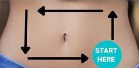 DIRECTIONS: It’s important to move in the clockwise direction described here. Start on the lower right side of your stomach, close to the pelvic bone. Using your fingertips, rub in a small circular motion upwards to your rib bones. Continue your small circles straight across to the left side of your rib bones. Then work your way down to the lower left side of your stomach, close to the pelvic bone, and make your way back to where you started. Repeat this massage for 2-3 minutes.
