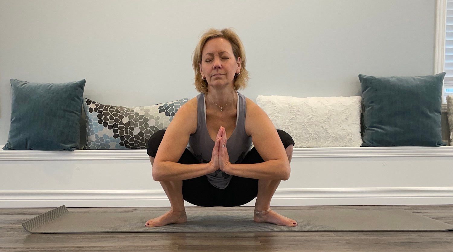 To get into the pose, start by standing with the feet slightly wider than hip-width apart and your toes pointed outward. Squat straight down with your hands in front of you as a guide. Once down, place your hands in prayer and your elbows on the inside of your knees. Gently push your elbows against the knees or shins to help open your hips a little more. Hold for 30-60 seconds.