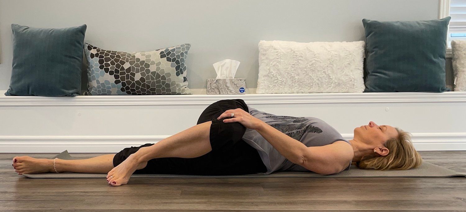 Lay on your back with your legs stretched out and your arms out to the side in a T shape. Pull your right knee toward your chest. Place your left hand on your right knee and use your hand to help guide your knee towards the left side, dropping your right knee toward the floor (or onto a block or pillow). Try to keep both shoulders on the floor. Hold for 30-60 seconds and repeat on the other side.